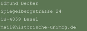 Alle Inhalte unterliegen dem Urheberrecht und dürfen nur mit meiner Genehmigung verwendet werden. Alle genannten oder dargestellten Marken- und Produktbezeichnungen sind Warenzeichen der entsprechenden Inhaber. UNIMOG ® ist eine eingetragene Marke der Daimler Truck AG, 70771 Leinfelden-Echterdingen. Sollte die Verwendung von Materialien irgendwelche Rechte verletzen, bitte ich um kurze Mitteilung, ich werde dann das betreffende Material sofort entfernen. Ich schließe die Zahlung von Abmahn- und sonstigen Anwaltskosten für den Fall aus, dass ich im Vorfeld nicht kontaktiert wurde. Kontaktdaten siehe oben.